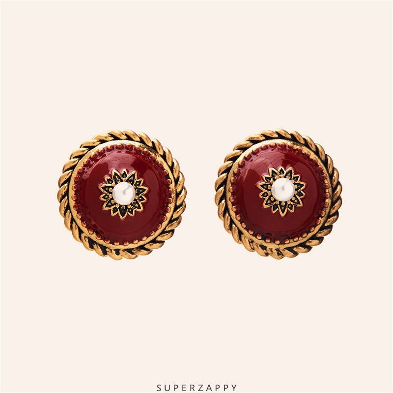 - Care Tips: To maintain the beauty of your French Red Enamel Pearl Disc Earrings, gently clean with a soft, dry cloth after each wear. Avoid exposing the earrings to harsh chemicals, perfumes, or prolonged moisture. Store them in a cool, dry place, preferably in a jewelry box or pouch, to prevent scratches and tarnishing.